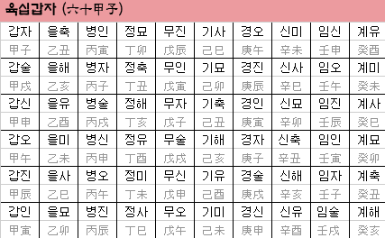 이 10 천간과 12 지지의 순환 조합으로 인해 60 갑자가 생성됩니다.