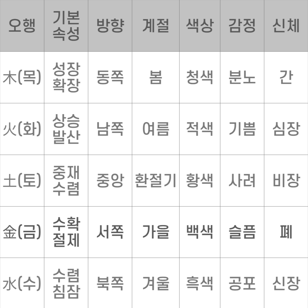 각 오행은 고유한 속성을 가지며 각 오행마다 상징하는 방향성, 계절, 색, 감정, 신체가 정해져 있습니다.